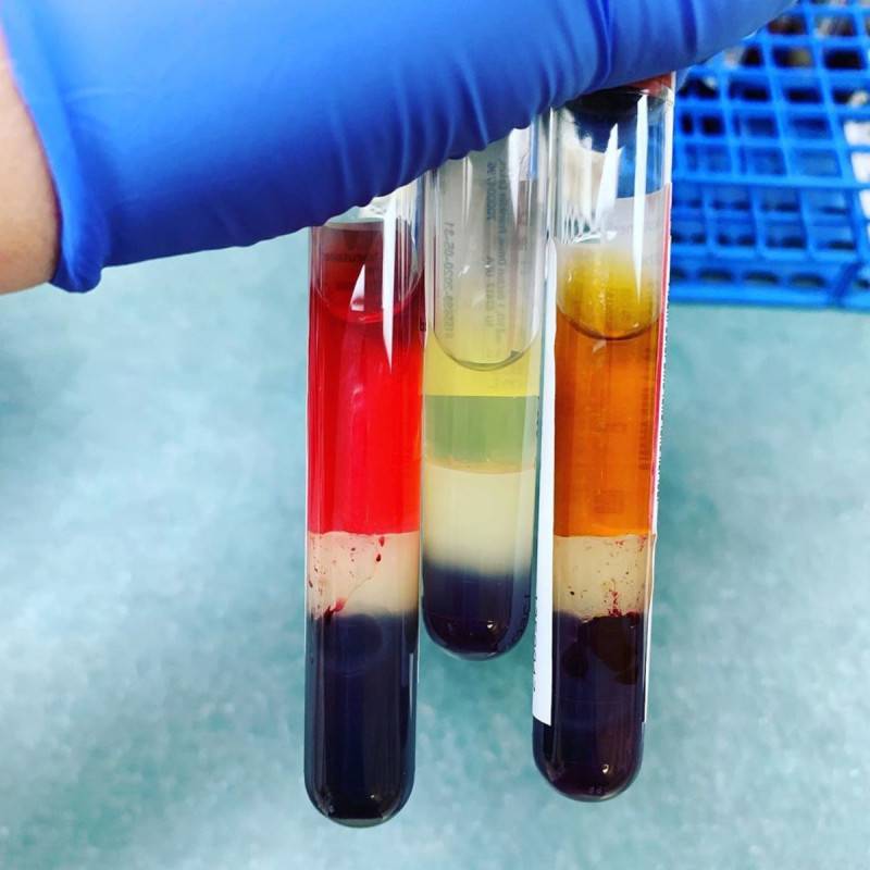 Чем тяжелее цельная кровь, тем эритроциты оседают на дне пробирки. Затем следующий слой – это лейкоцит, состоящий из лейкоцитов и тромбоцитов. Плазма – это фактически оставшийся бесклеточный супернатант.