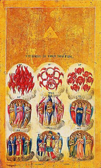 Согласно св. Дионисию Ареопагиту, Ангельская иерархия состоит из трех ликов, каждый из которых подразделяется еще на три. Всего — девять.