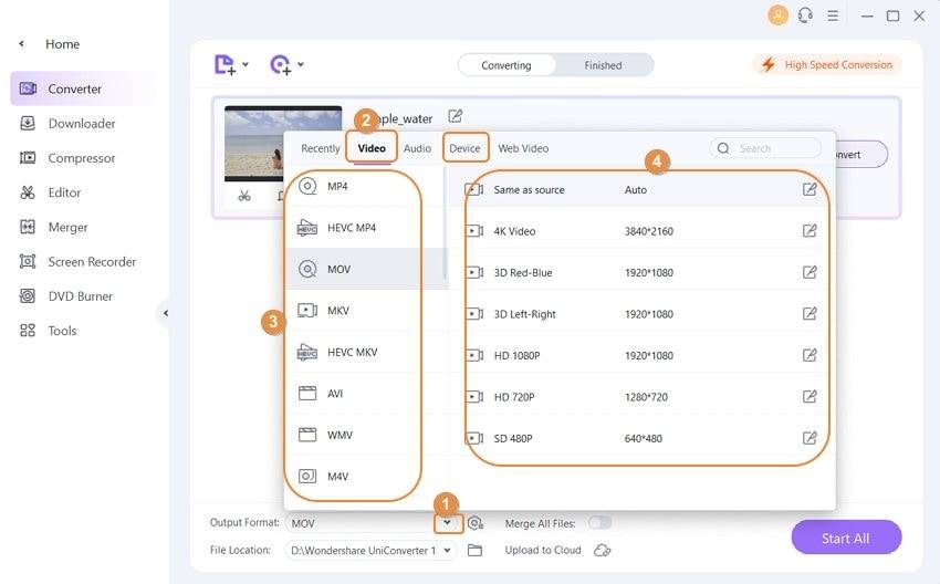 After adding the files to be converted, the output format needs to be selected. Click the drop-down arrow next to the Output Format option and select the desired format and resolution from the Video or Devices tab.