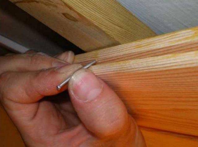 Принцип крепежа вагонки При забивании гвоздя, возможно, повреждение края вагонки. Такая конструкция крепежа исключает возможность демонтажа испорченного полотна вагонки. С заменой гвоздя на шуруп появляется возможность демонтировать крепление.
