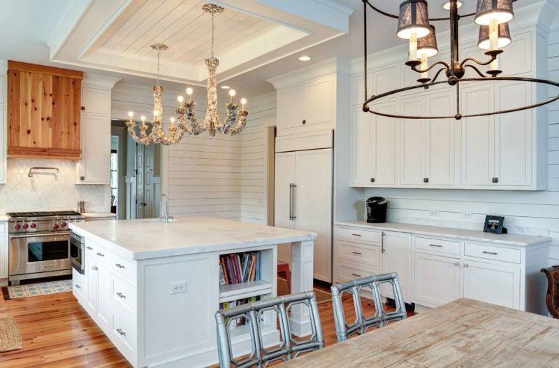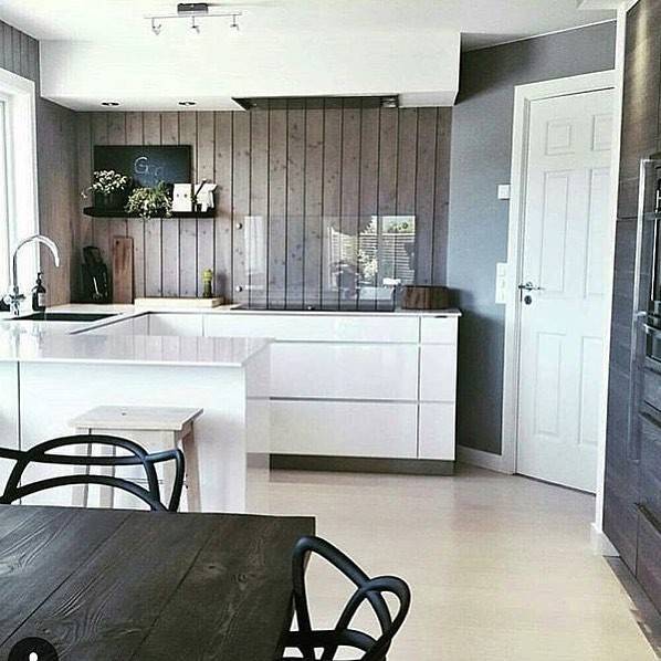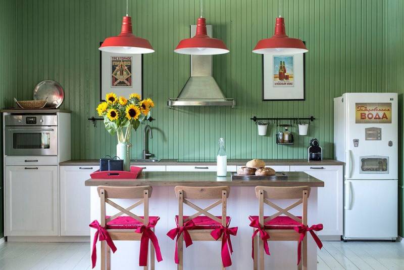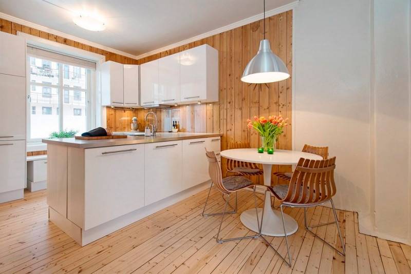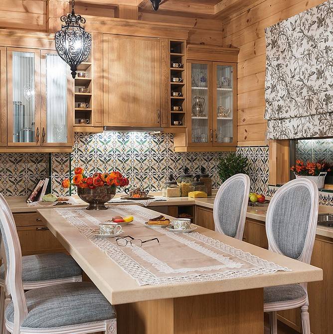 Внутри кухни можно все обшить вагонкой или просто сосредоточиться на обеденной зоне. Также вагонка красиво смотрится на кухонном фартуке. Хотите проблем с уборкой? Обработайте антисептиком и покройте влагостойкой краской.