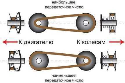 Вариатор имеет два диска или шкива, между ними натянут ремень или в редких случаях цепь. При движении данные шкивы сдвигаются или раздвигаются, изменяя этим передаточное число. Отличием вариатора от автомата является тот факт, что у него полностью отсутствуют передачи. Данный механизм был разработан со следующей целью: сделать переход с одной скорости на другую максимально плавно, что является результатом отсутствия разрыва мощностей. Водитель и пассажиры автомобиля получают максимальный комфорт от поездки на автомобиле с вариатором, что обеспечено удивительной плавностью хода. Управление такой КПП почти ничем не отличается от управления классическим автоматом. Вариатор имеет свои явные плюсы, но, к сожалению, это совсем не идеальный вариант и конструкторам еще предстоит длительная работа по устранению ряда недостатков. Плюсами и минусами вариатора можно считать следующие моменты: