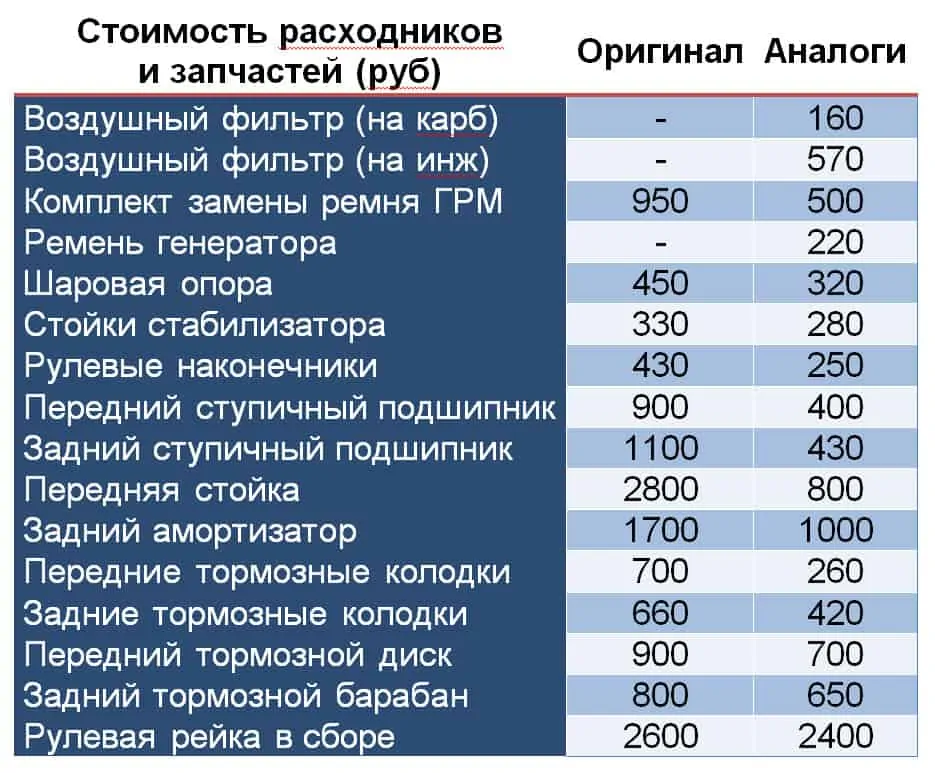 - Наявність запчастин, що залишилися від попередніх моделей ВАЗа, наштампованих у величезній кількості).