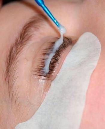 Наносится средство Sculpturing Lotion, которое раскроет кутикулу волосинок, подготовив их к принятию следующих составов. Кисточкой аккуратно и тщательно обрабатывается каждая ресничка. Излишки состава удаляются сухой салфеткой.