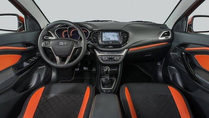 Интерьер Весты, наоборот, имеет ярко выраженный спортивный стиль. Контрастные вставки из цветного пластика придают дизайну энергичное современное звучание, но без излишней крикливости. Панель приборов выглядит гармонично и довольно удобна в работе.