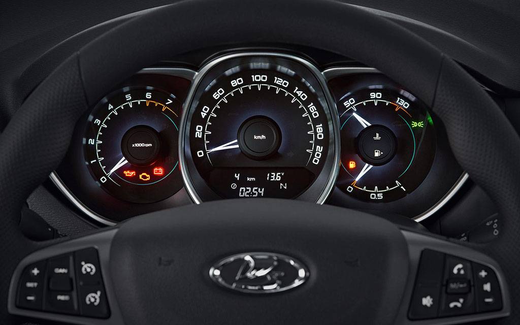 Внутренне убранство этих двух машин значительно отличается друг от друга. Дизайнеры АвтоВАЗа явно взяли за основу спортивный вариант, и это прослеживается во многих деталях. Приборная панель выделяется глубокими колодцами, которые дополняются стильным трёхспицевым рулевым колесом. Центральная консоль современная и, что удивительно для отечественного производителя, привлекательная. В качестве основного материала передней панели Весты выбран чёрный пластик, дополняется он незначительным количеством металлических вставок.