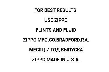 Что в переводе означает : для лучшего результата используйте Zippo кремнии и топливо. Берегите от детей. После заправки вытирайте зажигалку и руки перед использованием. Зажигалка сама не гаснет. чтобы ее погасить – закройте крышку.