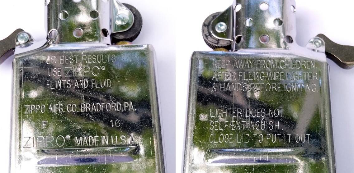 Вынув из корпуса резервуар с топливом, вы увидите на одной его стороне надпись, которая рекомендует пользоваться оригинальными кремнями и топливом. Кроме того, там же будет нанесено: «ZIPPO MFG. СО. BRADFORD, PA.», «Made in ZIPPO U.S.A.» или «ZIPPO Made in U.S.A.». На обратной стороне инсерта содержится предостережение о необходимости держать зажигалку вдали от детей, а также вытирать руки после заправки и перед началом пользования изделием. Все надписи на оригинальной продукции выполнены на английском языке без ошибок и нанесены методом штамповки.